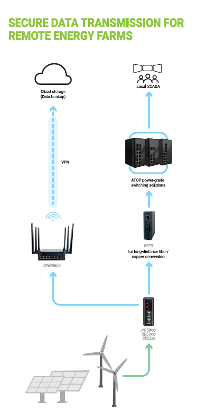 Another highly effective capability in dispersed sites is enabling direct cloud connectivity from end devices out in the field. With wireless solutions, installation can be greatly simplified and costs reduced. ATOP’s industrial-grade cellular Wi-Fi routers not only enables secure wireless data transmission through VPN, but also protects assets with robust, weatherproof hardware. Due to the critical nature of the energy industry, wired and wireless pathways can also be used concurrently for fault-tolerance and backup.